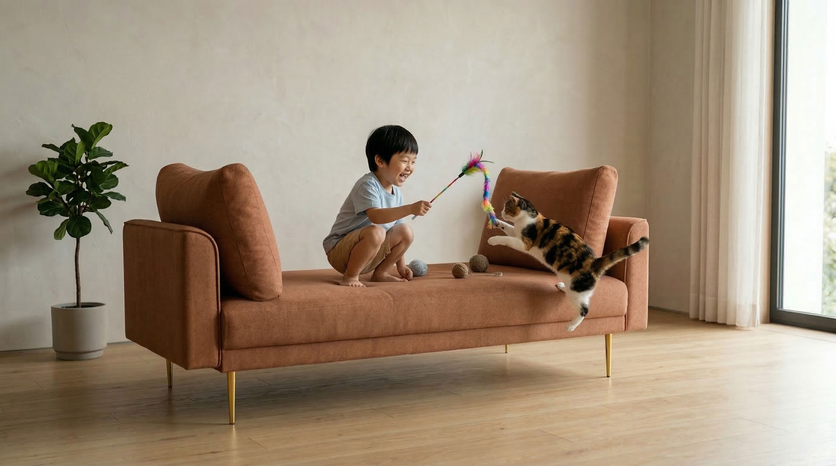 許多標榜防刮的貓抓布沙發,常因塗層過厚而顯得悶熱。GREEN HOUSE 綠屋家居特別引進「會呼吸的貓抓布」,透過增加纖維厚度的技術提升透氣度,打造出細膩、親膚且不悶熱的觸感 。最令人驚豔的是其強大的疏水抗污能力,飲料灑出時會在表面形成水珠,僅需衛生紙或專用清潔劑即可輕鬆打理 。這不僅省下了昂貴的清潔費用,更讓您與寵物、孩子共處的時光變得輕鬆無壓。