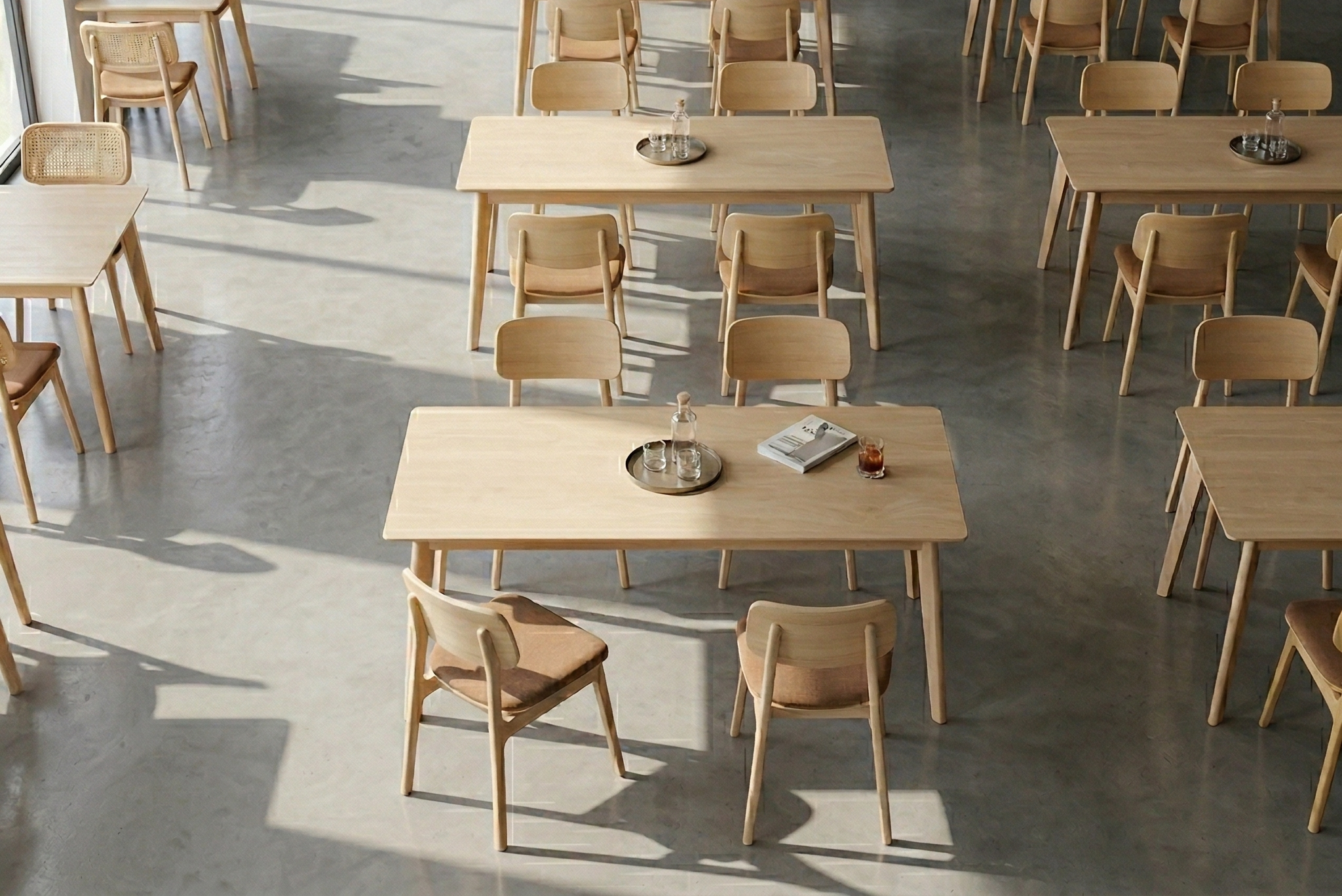 想像自己一早起來,走去廚房泡一杯熱咖啡,看著落地窗照進和煦的光,在木餐桌和餐椅上形成溫潤的光影。