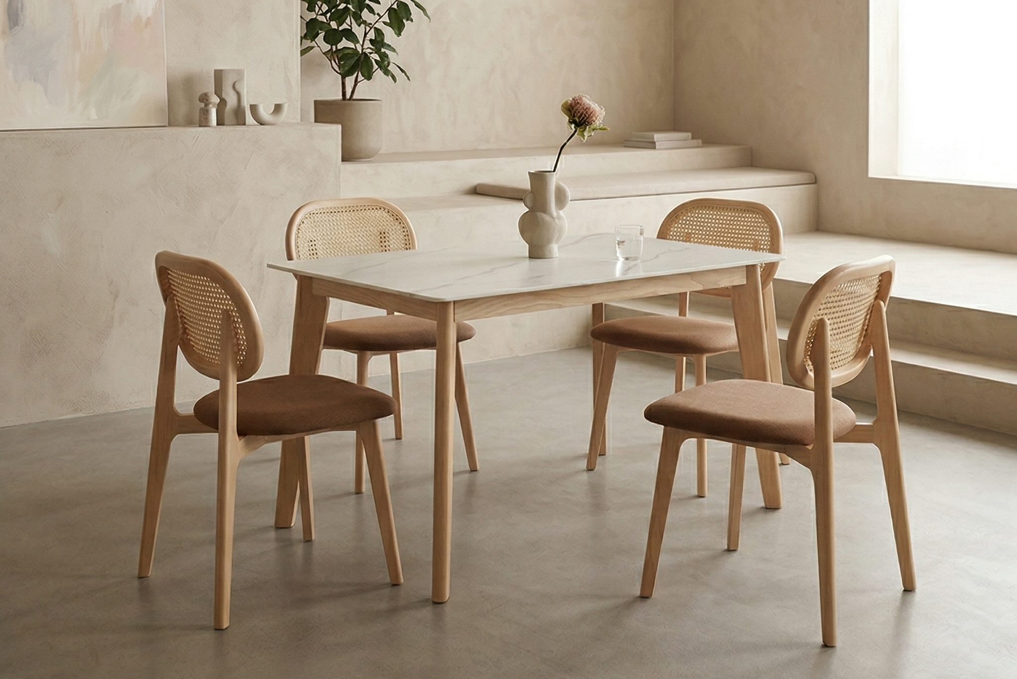 藤編的細膩纹理與櫸木的紮實質地,形成了一種視覺上的對比美學,讓原本可能顯得厚重的木製家具,瞬間變得靈動且具備高度的設計細節。