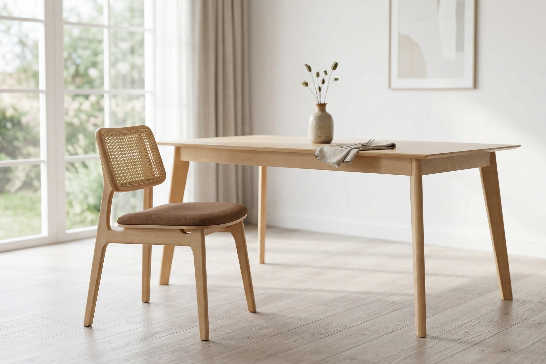 藤編的細膩纹理與櫸木的紮實質地,形成了一種視覺上的對比美學,讓原本可能顯得厚重的木製家具,瞬間變得靈動且具備高度的設計細節。