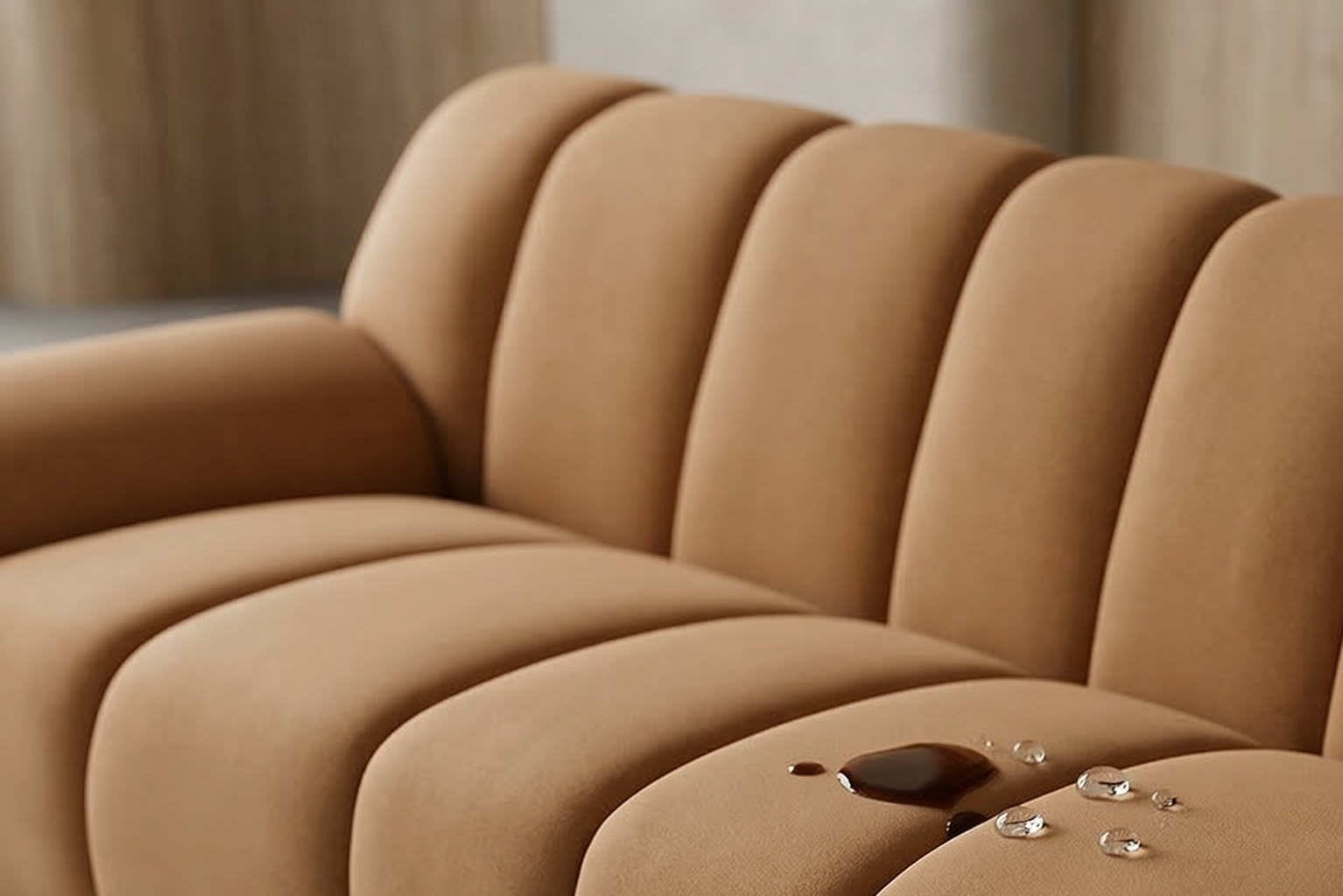 我們的布料具備優異的防水防汙特性,當液體不小心灑到沙發上時,它會在表面形成水珠而不輕易滲入 。