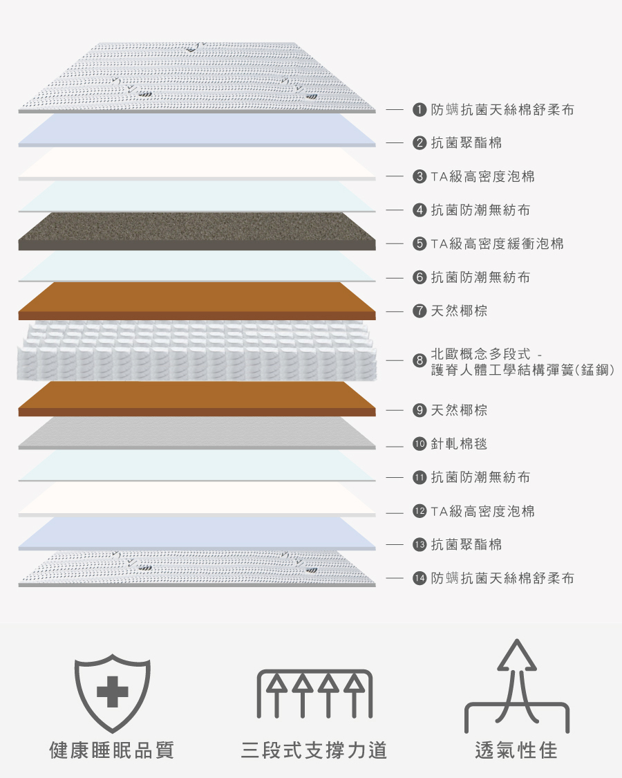 材質:防螨抗菌天絲綿舒柔布 / 天然椰棕 / 高錳碳鋼