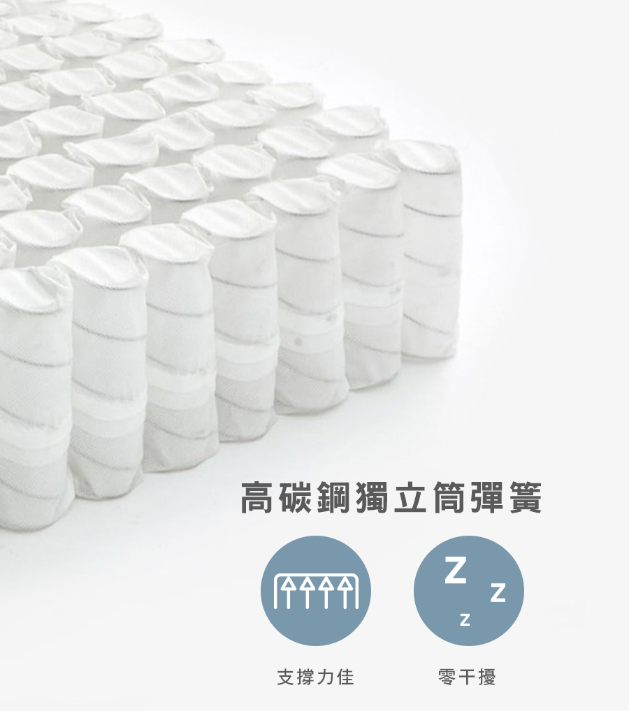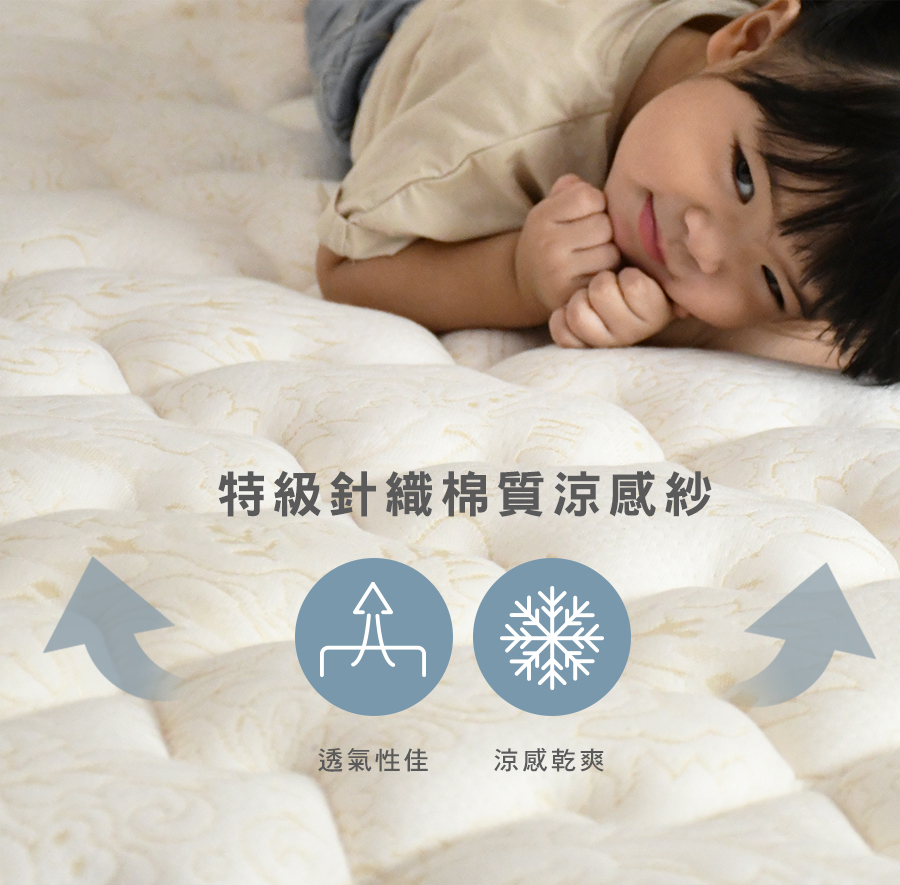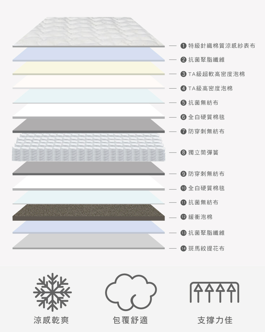原物料:棉質涼感紗表布 / 14層內材 / 獨立筒彈簧