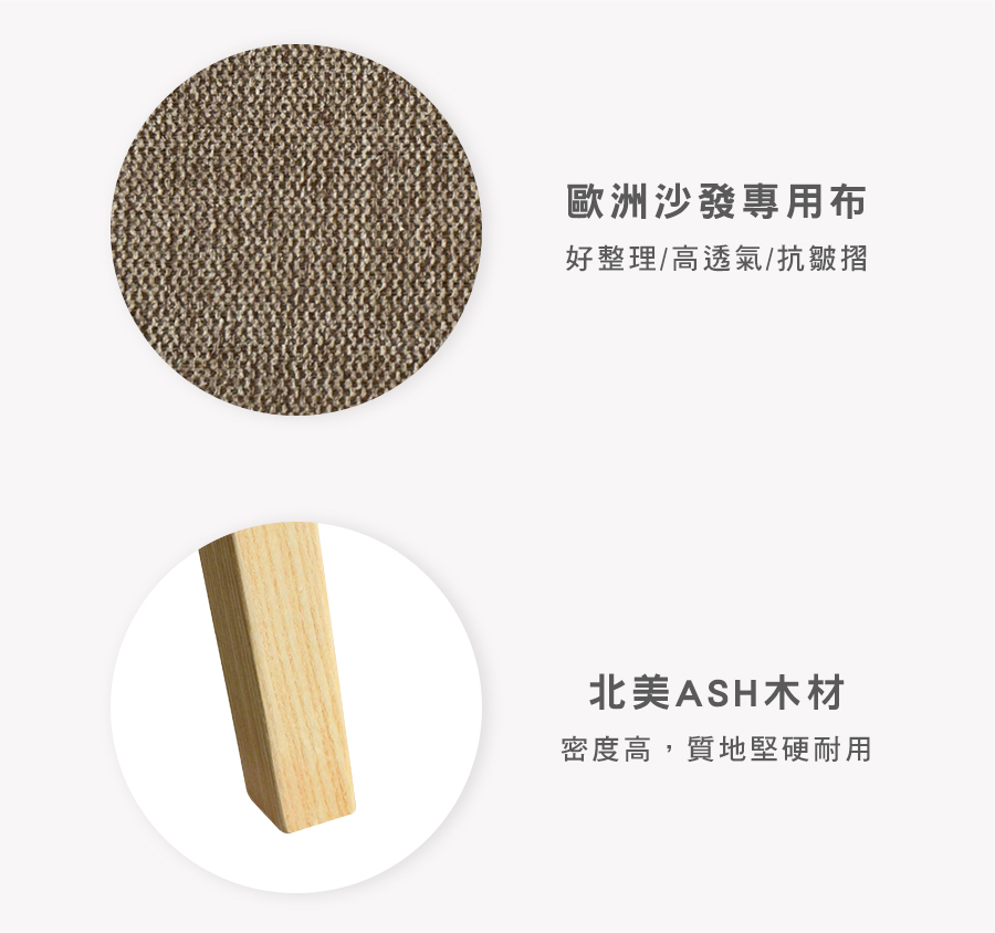 原物料:北美天然梣木(ASH) / 人造藤 / 歐洲沙發專用布 / 高密度泡棉