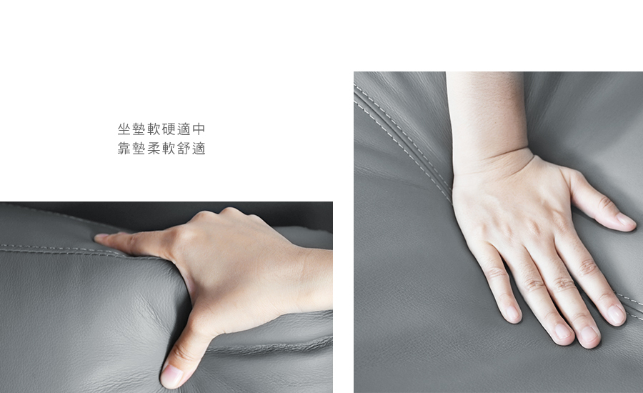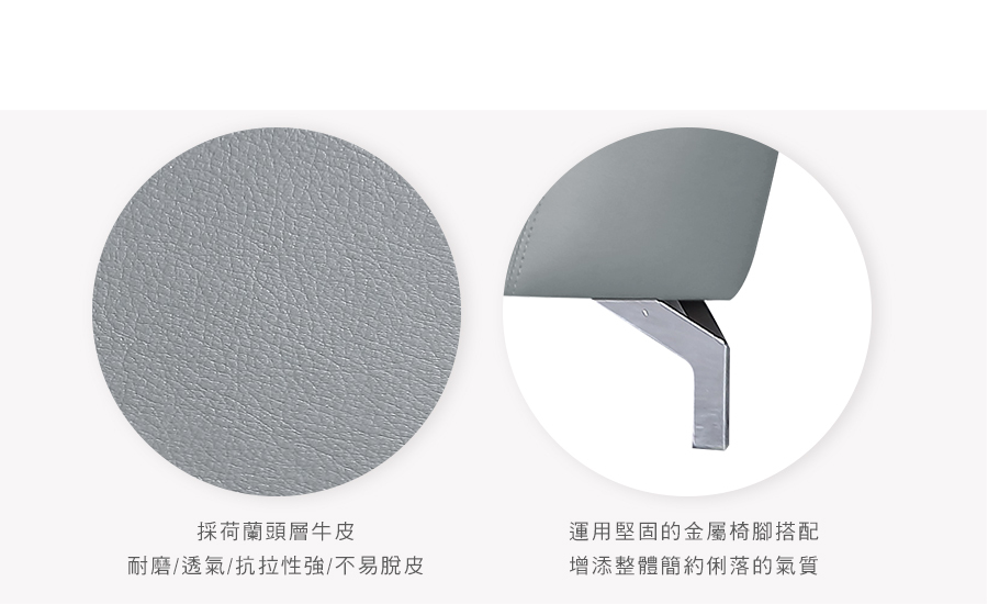 經常接觸的椅面部分,採用透氣、柔軟的荷蘭頭層牛皮,堅韌耐用,呈現自然變化;其餘部分為PVC,防止受潮及黴菌滋生