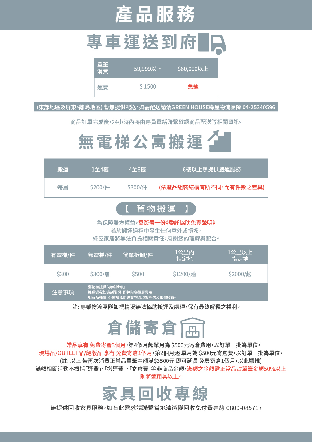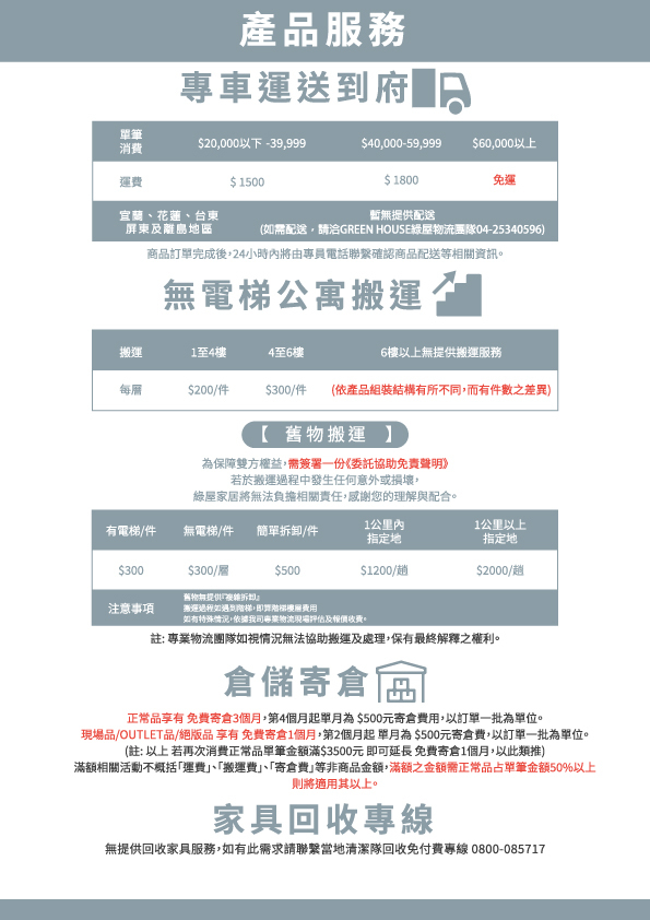 GREEN HOUSE綠屋家居採內建物流團隊親自載運及組裝服務。