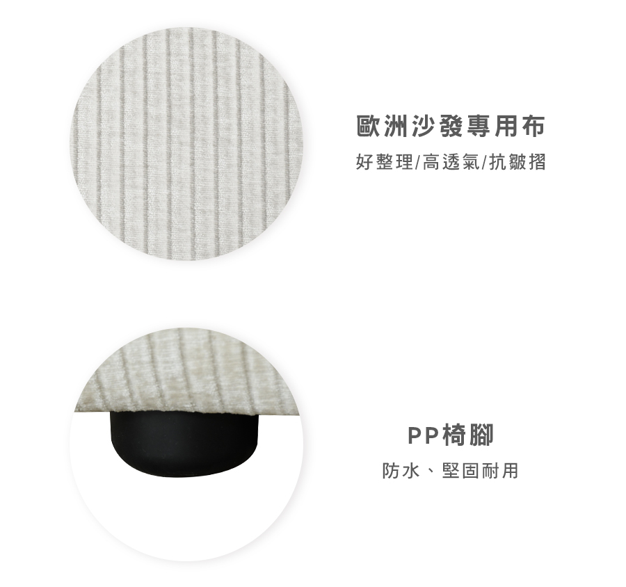 原物料:歐洲沙發專用布 / 12層內材 / PP椅腳