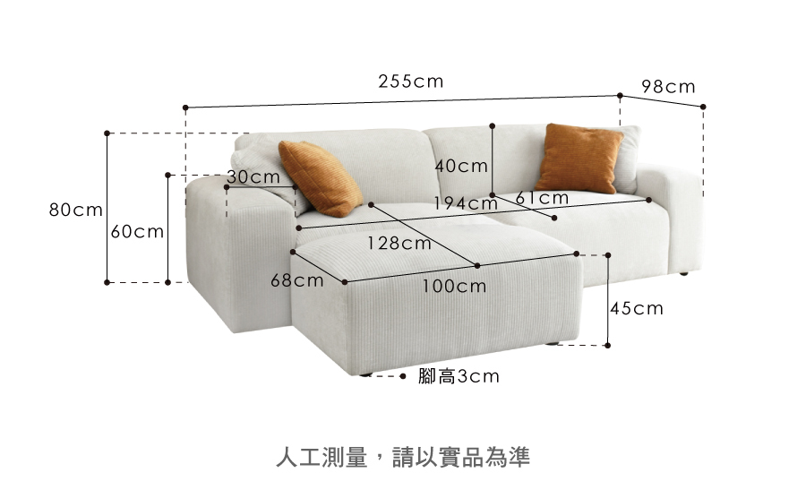 尺寸:沙發: 255 x 98 x 80 cm / 椅凳: 100 x 68 x 45 cm