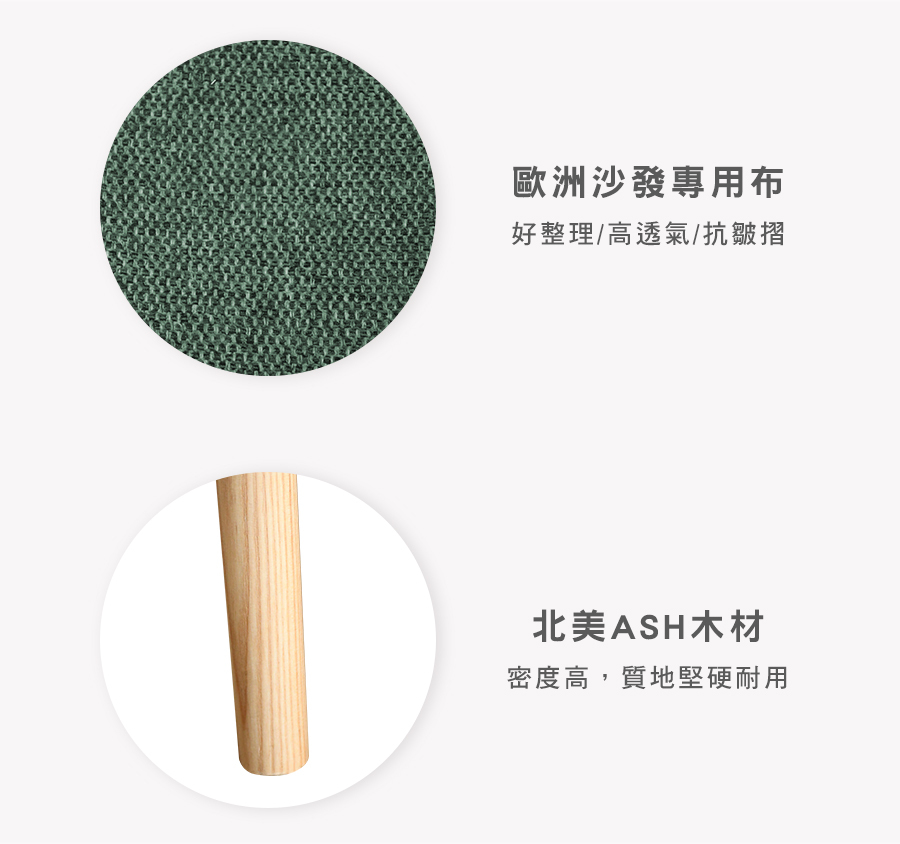 材質:歐洲沙發專用布 / 北美天然梣木(ASH) / 高密度泡棉